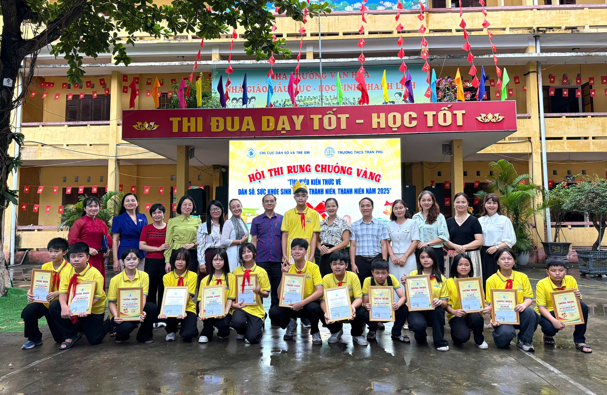 Chiều ngày 29/9, tại Trường THCS Trần Phú (phường Bắc Giang, tỉnh Bắc Ninh), Chi cục Dân số và Trẻ em tỉnh Bắc Ninh phối hợp với Trường THCS Trần Phú tổ chức Hội thi “Rung chuông vàng” với chủ đề Tìm hiểu kiến thức dân số và chăm sóc sức khỏe sinh sản vị thành niên, thanh niên năm 2025. Hội thi có sự tham dự của lãnh đạo Chi cục Dân số và Trẻ em tỉnh Bắc inh, các thày cô giáo, Ban đại diện cha mẹ học sinh Trường THCS Trần Phú.