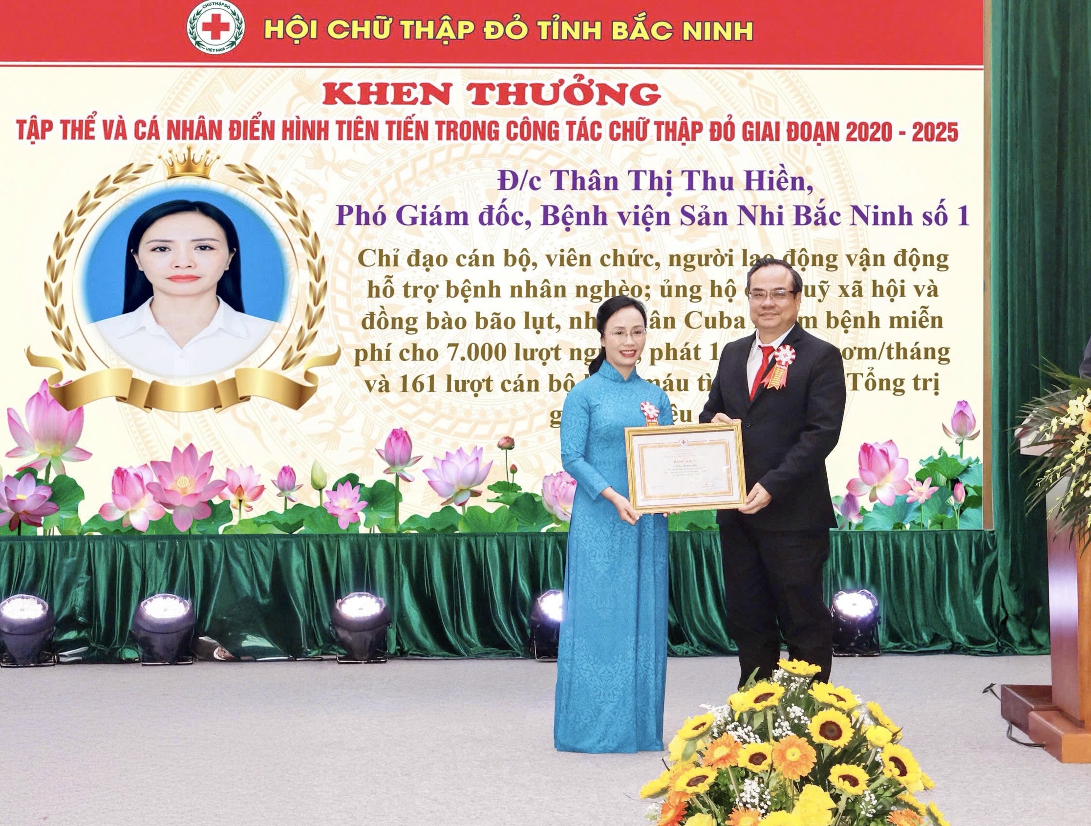 Sáng 14/11/2025, tại Trung tâm Hội nghị tỉnh, Hội Chữ thập đỏ tỉnh Bắc Ninh tổ chức Hội nghị Điển hình tiên tiến lần thứ I, giai đoạn 2025 – 2030 và khen thưởng các tập thể, cá nhân có thành tích xuất sắc trong công tác Hội và phong trào Chữ thập đỏ. Tại Hội nghị, Chi hội Chữ thập đỏ Bệnh viện Sản Nhi Bắc Ninh Số 1 vinh dự được Ủy ban Mặt trận Tổ quốc Việt Nam tỉnh Bắc Ninh tặng Bằng khen vì những đóng góp nổi bật trong hoạt động nhân đạo giai đoạn 2020 – 2025. Đồng chí Thân Thị Thu Hiền – Phó Giám đốc, Chi hội trưởng Chi hội Chữ thập đỏ Bệnh viện – cũng được Ban Chấp hành Trung ương Hội Chữ thập đỏ Việt Nam tặng Bằng khen vì thành tích xuất sắc trong công tác Hội năm 2025.
