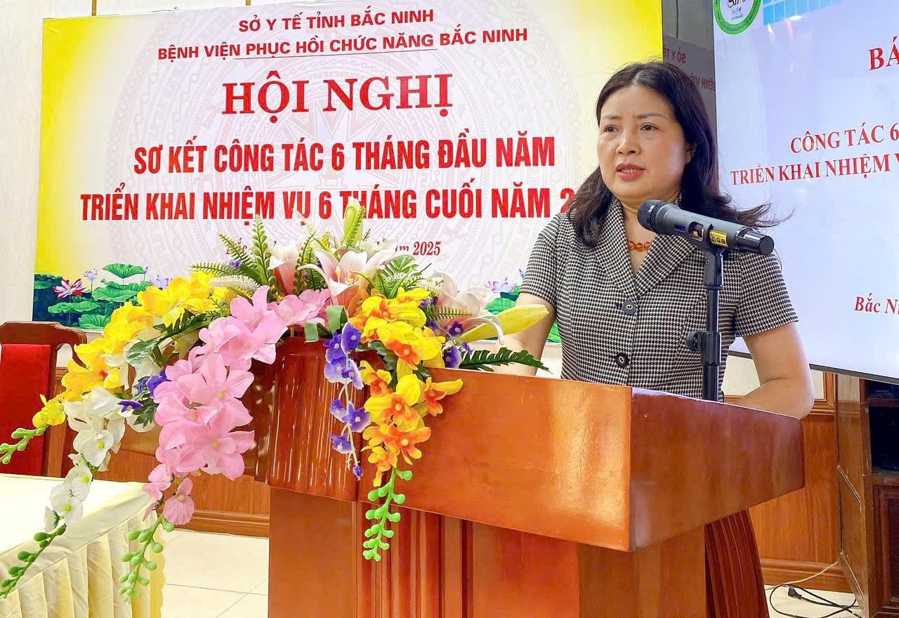 Phát biểu chỉ đạo Hội nghị, đồng chí Nguyễn Thị Thu Hương, Phó Giám đốc Sở Y tế tỉnh Bắc Ninh đã gửi lời chúc mừng đến các đồng chí vừa được bổ nhiệm giữ cương vị lãnh đạo chủ chốt tại đơn vị; đồng thời, biểu dương những kết quả nổi bật mà tập thể bệnh viện đã đạt được trong 6 tháng đầu năm 2025. Phó Giám đốc Sở nhấn mạnh vai trò quan trọng của bệnh viện chuyên khoa đầu ngành của tỉnh trong lĩnh vực phục hồi chức năng. Đồng chí đề nghị bệnh viện cần chủ động xây dựng định hướng phát triển, tập trung phát triển chuyên môn sau kỹ thuật Phục hồi đa chuyên ngành, nhất là các kỹ thuật đặc thù của chuyên ngành Phục hồi chức năng giúp nâng cao hiệu quả chăm sóc và điều trị người bệnh; Tích cực triển khai thực hiện chuyển đổi số trong lĩnh vực y tế, từng bước xây dựng bệnh viện thông minh; xây dựng kế hoạch triển khai các đề án, dự án theo từng giai đoạn cụ thể, định hướng phát triển bền vững cho Bệnh viện.