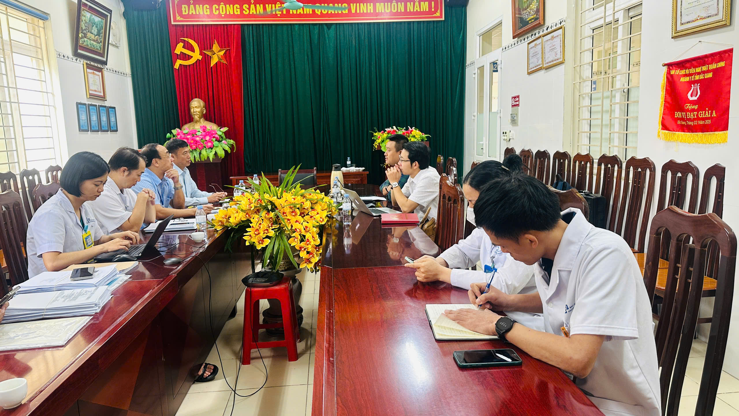 Đ/c Nguyễn Danh Song,  Giám đốc Bệnh viện Ung bướu Bắc Ninh cùng đội ngũ nhân viên y tế làm việc với đoàn công tác Bộ Khoa học và Công nghệ.