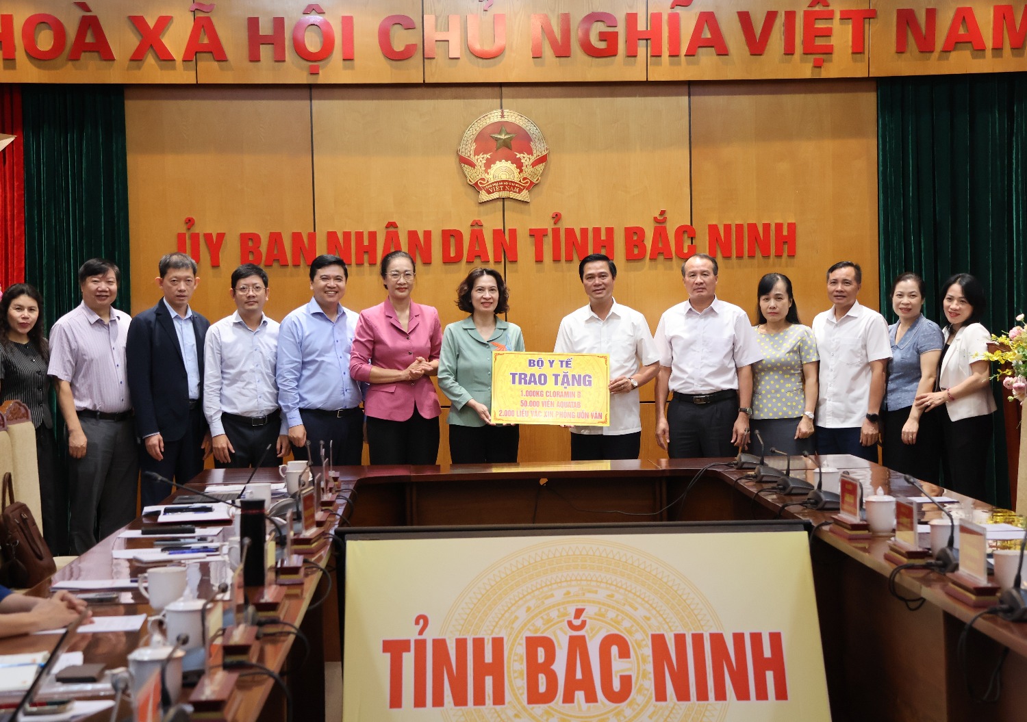 Nhân dịp này, thay mặt Bộ Y tế, đồng chí Nguyễn Thị Liên Hương đã trao hỗ trợ tỉnh 1000kg CloraminB, 50.000 viên Aquatab, 2000 liều vắc xin uốn ván phục vụ công tác phòng, chống dịch; Quỹ Ngày mai tươi sáng trao tặng 100 triệu đồng hỗ trợ bệnh nhân ung thư tỉnh Bắc Ninh; Hội Giáo dục chăm sóc sức khỏe cộng đồng Việt Nam trao tặng 100 triệu đồng; Bộ Y tế cùng với Bệnh viện K và Công đoàn Y tế Việt Nam trao tặng 300 triệu đồng tiền mặt để đồng hành cùng với tỉnh Bắc Ninh khắc phục hậu quả cơn bão số 11.