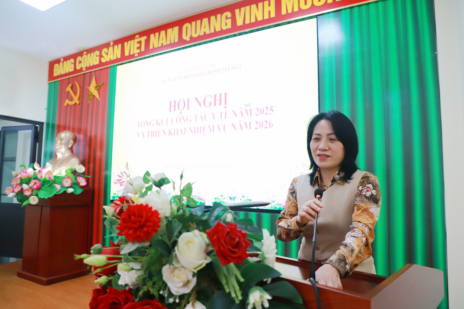Trung tâm Kiểm soát bệnh tật Bắc Ninh số 2 hiện có 188 viên chức, người lao động với 16 khoa, phòng chuyên môn. Trong năm 2025, công tác y tế do đơn vị phụ trách được triển khai thực hiện có hiệu quả. 100% bệnh dịch mới phát sinh được phát hiện và kịp thời xử lí; không có dịch lớn xảy ra. Tất cả các chỉ tiêu liên quan đến tiêm chủng mở rộng đều hoàn thành đạt và vượt kế hoạch đề ra. Đơn vị duy trì có hiệu quả các hoạt động phòng chống HIV/AIDS gồm điều trị ARV, Methadone, can thiệp, dự phòng lây truyền HIV từ mẹ sang con và đặc biệt là hoạt động điều trị dự phòng trước phơi nhiễm HIV cho người có nguy cơ cao (PrEP). Các hoạt động chăm sóc sức khỏe sinh sản và bà mẹ, trẻ em; dinh dưỡng; phòng chống bệnh không lây nhiễm được triển khai đúng kế hoạch. Trong năm, 100% đơn vị cấp nước được ngoại kiểm; 100% chất thải y tế phát sinh được xử lí đúng quy định; trên 98% trường học được giám sát và triển khai khám sức khỏe học sinh đúng quy định. Công tác quản lý vệ sinh lao động, quan trắc môi trường và khám phát hiện bệnh nghề nghiệp được triển khai góp phần chăm sóc sức khỏe công nhân và nâng cao hiệu quả hoạt động cho các doanh nghiệp. Hoạt động truyền thông y tế được triển khai rộng khắp từ tỉnh đến xã với đa dạng các nền tảng, giúp người dân tiếp cận thông tin nhanh chóng, chính xác và kịp thời. Công tác khám chữa bệnh được duy trì giúp người dân trên địa bàn được chăm sóc sức khỏe tốt hơn.