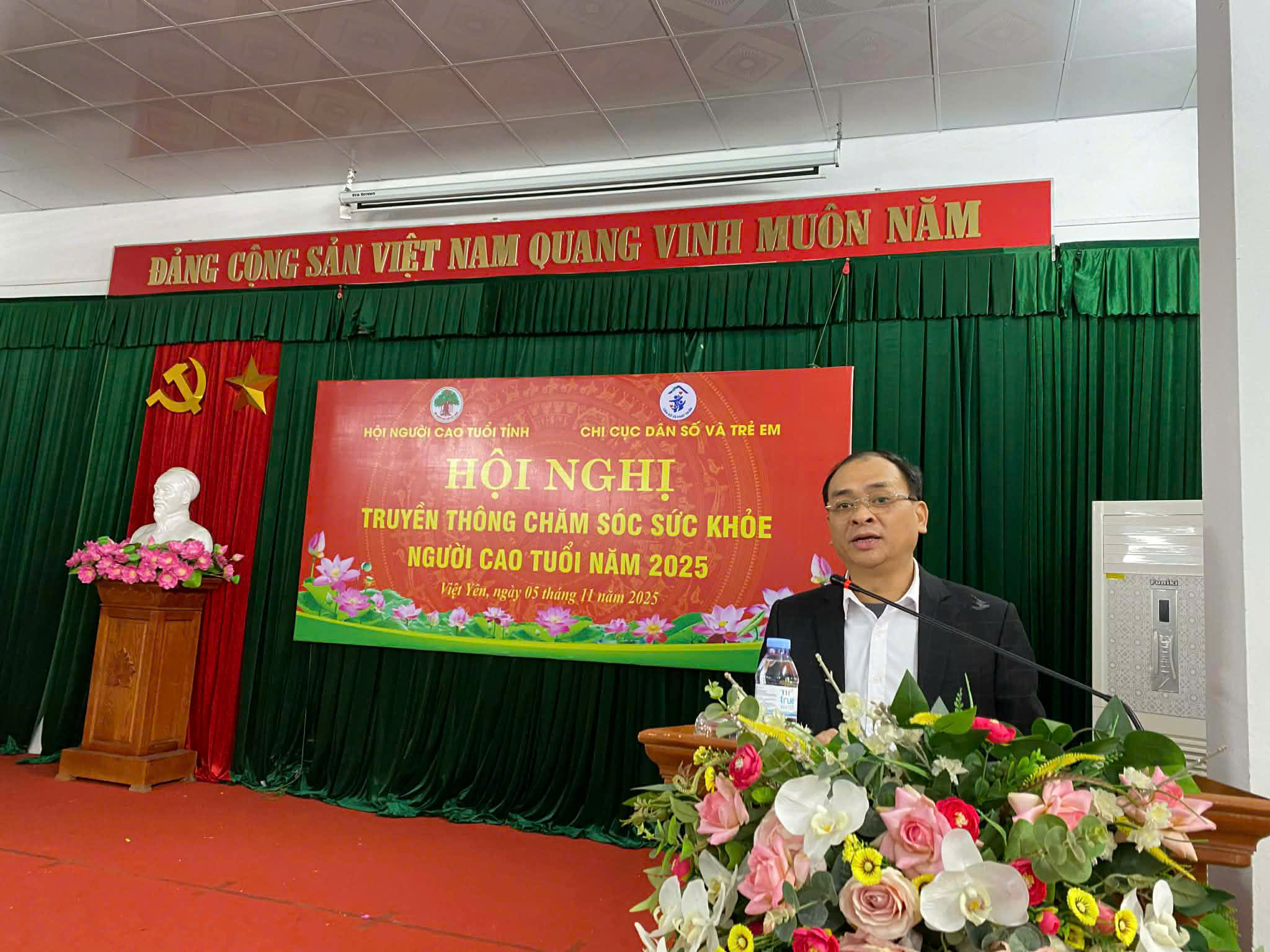 Ngày 05/11/2025, Chi cục Dân số và Trẻ em phối hợp với Hội Người cao tuổi tỉnh tổ chức Hội nghị truyền thông chăm sóc sức khỏe người cao tuổi tại phường Việt Yên. Hội nghị có gần 200 đại biểu tham dự, gồm đại diện lãnh đạo Chi cục Dân số và Trẻ em, Hội Người cao tuổi tỉnh, cùng lãnh đạo và hội viên Hội Người cao tuổi phường Việt Yên.